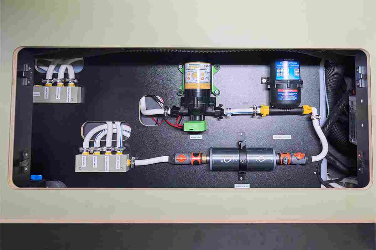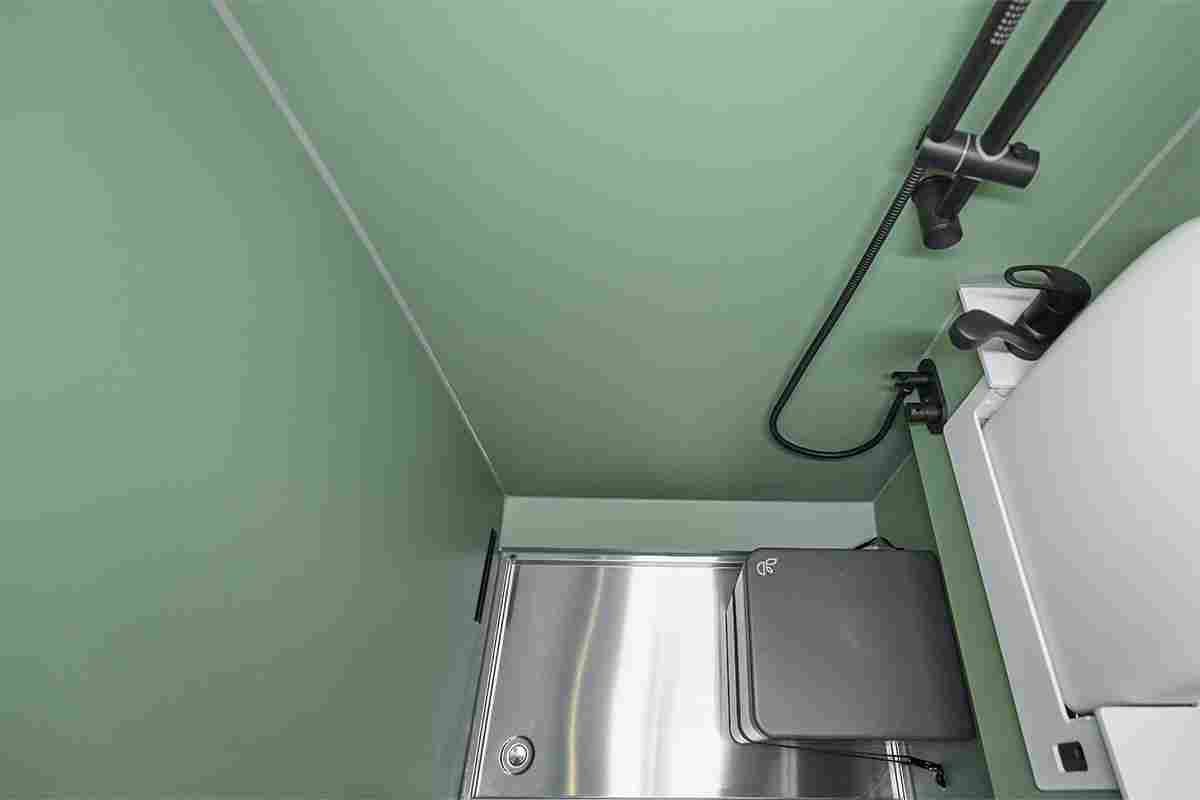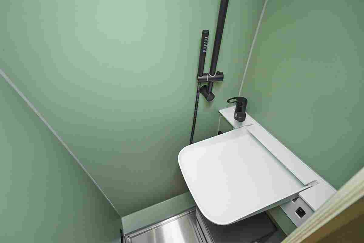 Das Herzstück im Innenraum ist das innovative Hubbett im Heck, das mit einem Handgriff Großzügigkeit schafft: mehr Laderaum, optimale Erreichbarkeit der Stauräume und zugleich ein behaglicher Rückzugsort. Direkt gegenüber der funktionalen Küche öffnet sich das vollwertige Badezimmer mit Trenntoilette, Dusche und clever integriertem Klappwaschbecken – eine Ausstattung, die unterwegs kaum Wünsche offenlässt.