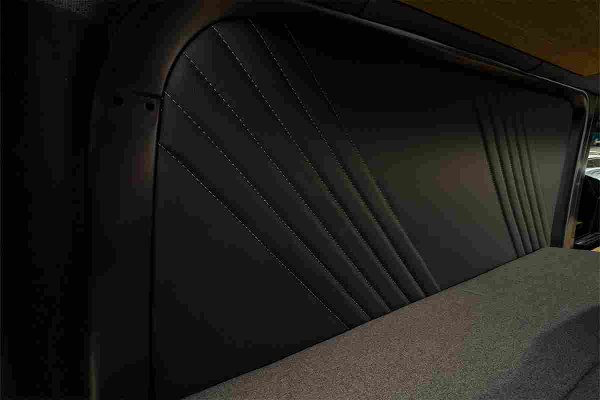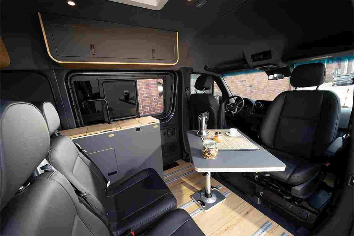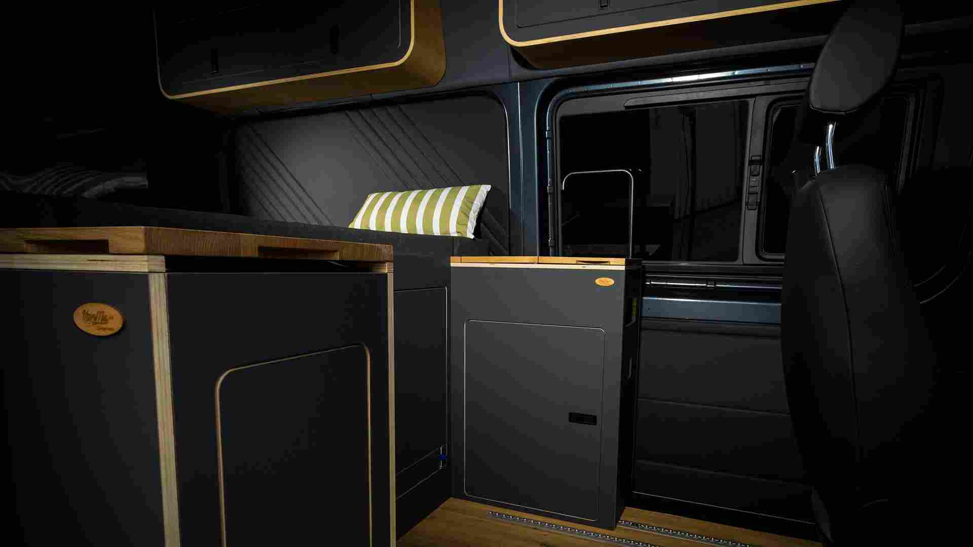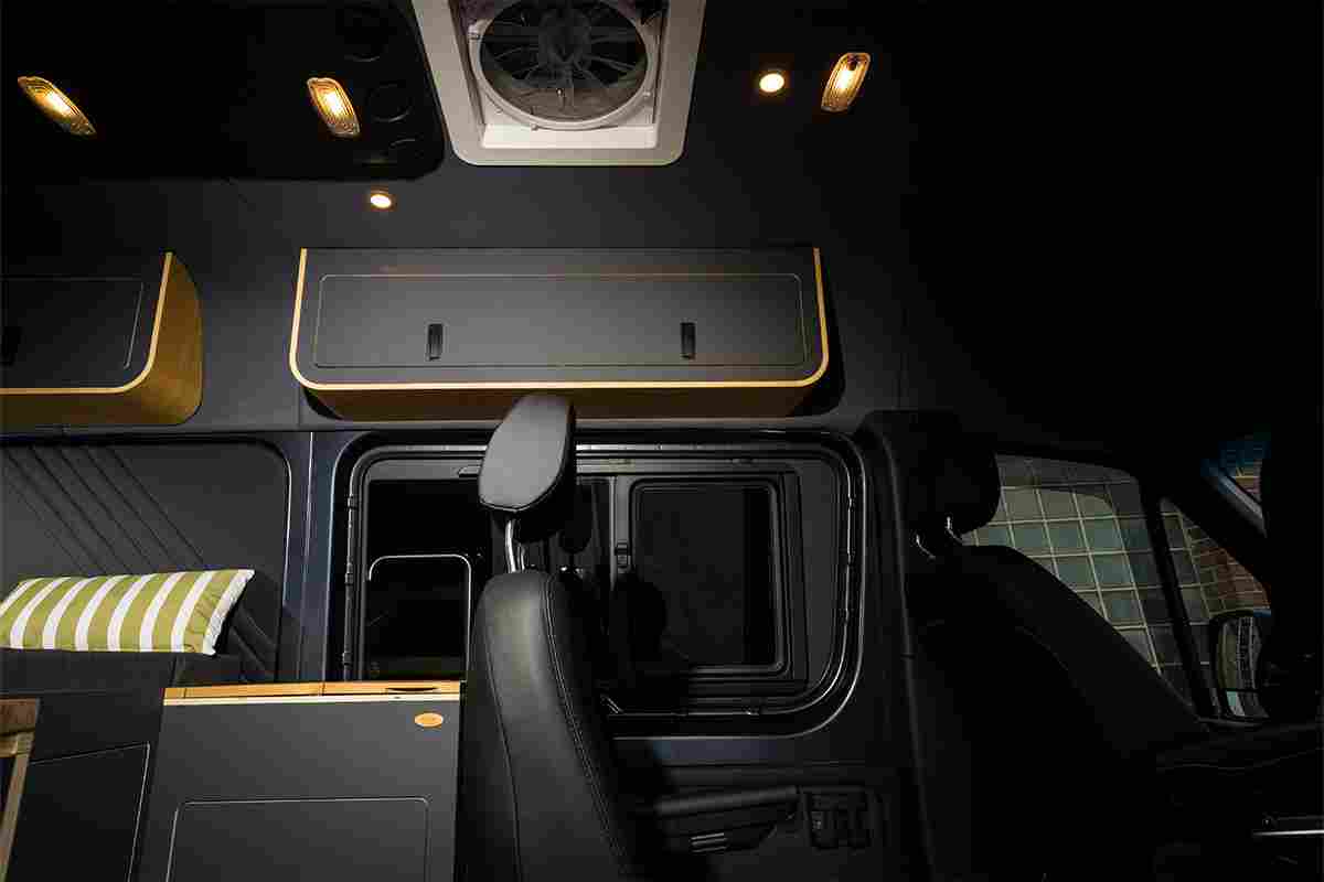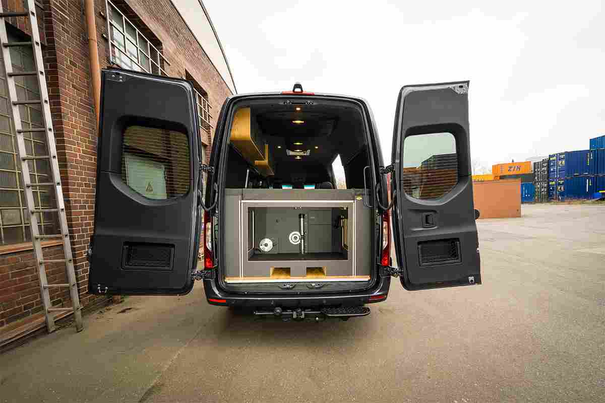 Der Ausbau integriert sich in die vorhandene Ausstattung von Mercedes Benz.