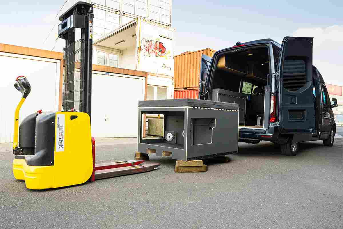 Das Heckmöbel lässt sich mit einem Hochhubwagen entnehmen