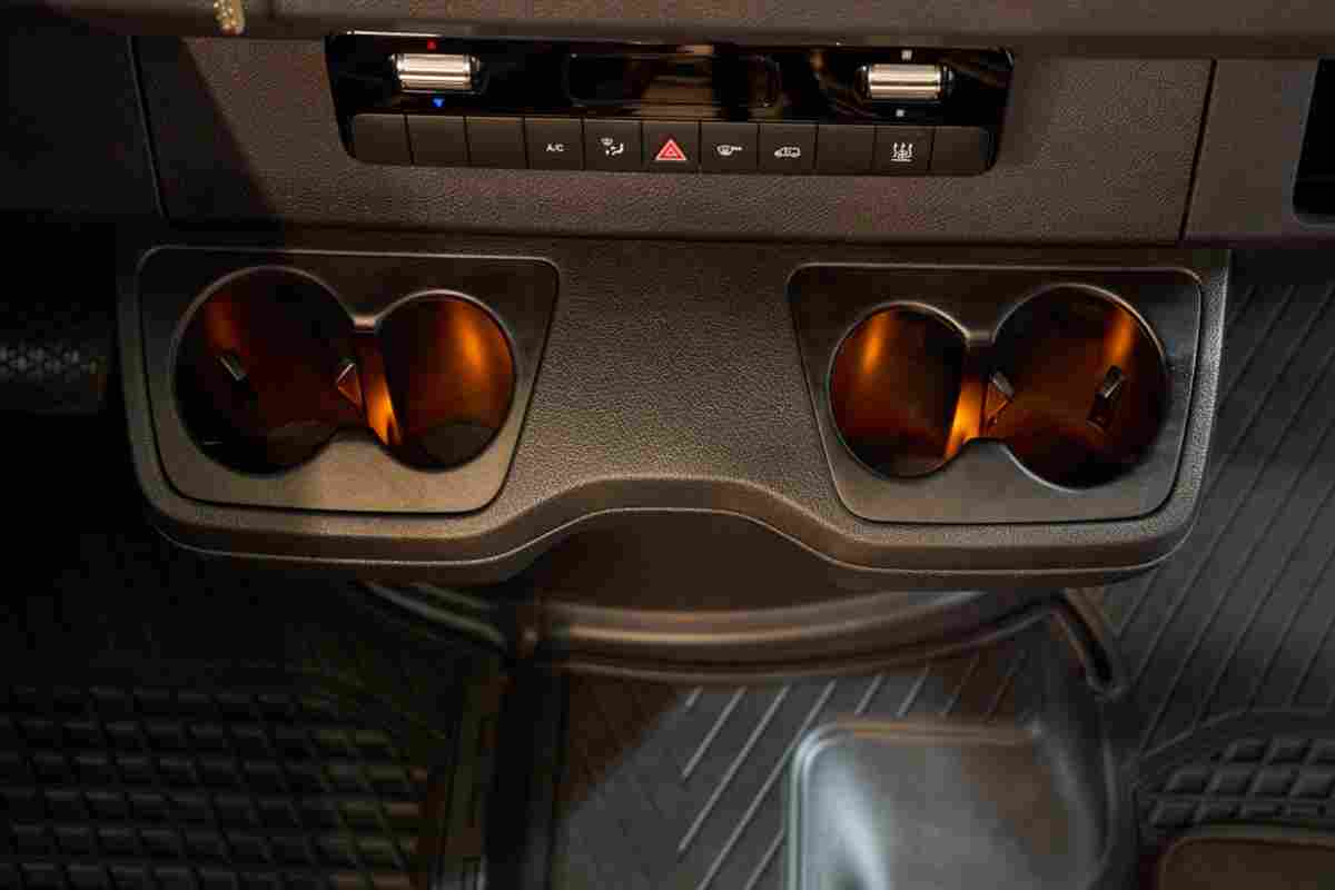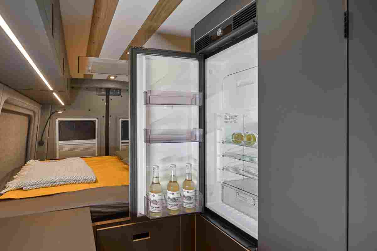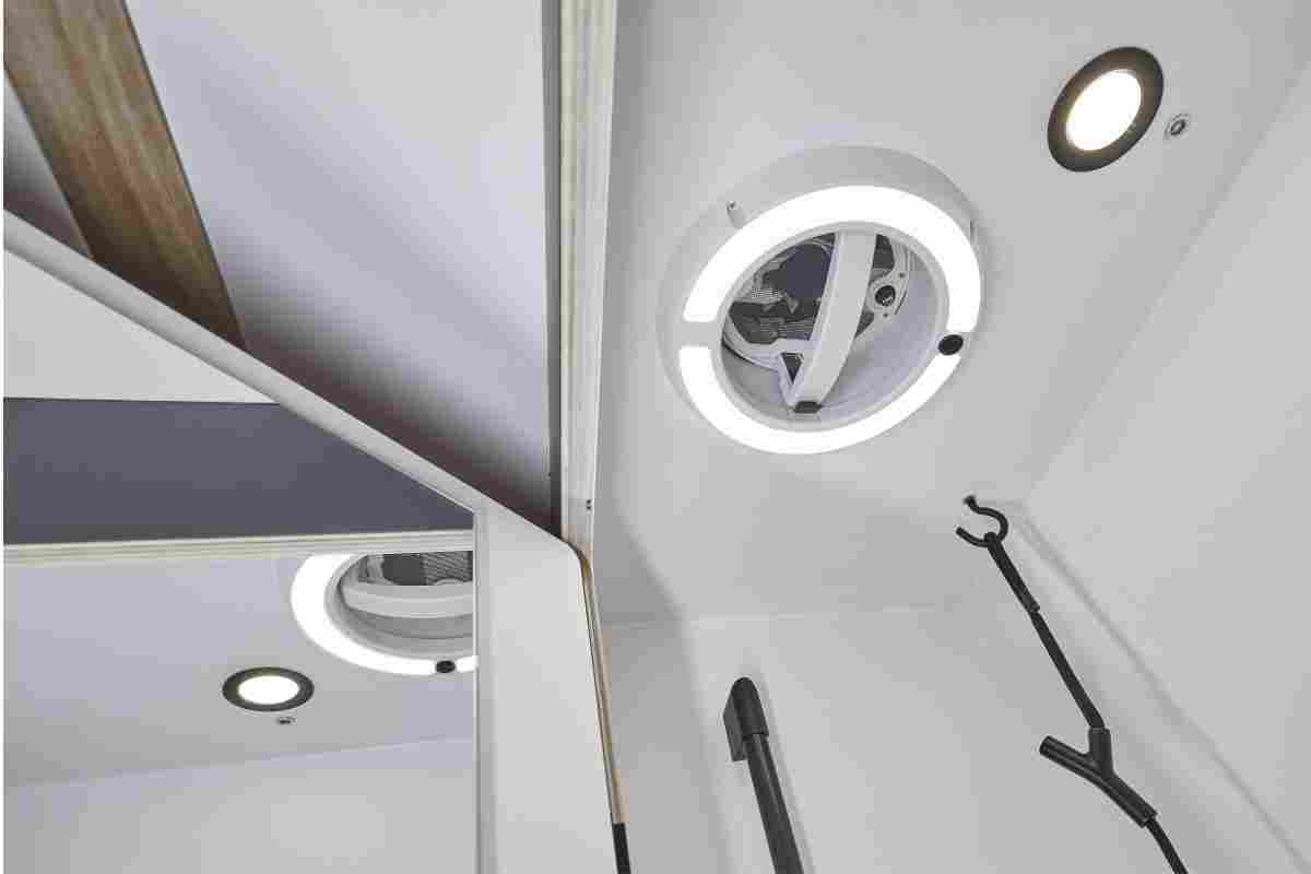Ein beleuchteter Versatz entlang der Möbelfronten setzt subtile Akzente und verleiht dem Innenraum Tiefe und Atmosphäre. Ergänzt wird das Konzept durch innovative Ausstattungsdetails wie das EcoFlow Independence Kit für autarke Stromversorgung und einen Fliesenspiegel aus echtem Stein – Ausdruck von Funktionalität und Exklusivität zugleich.