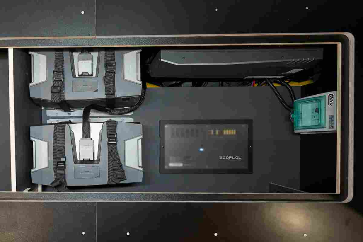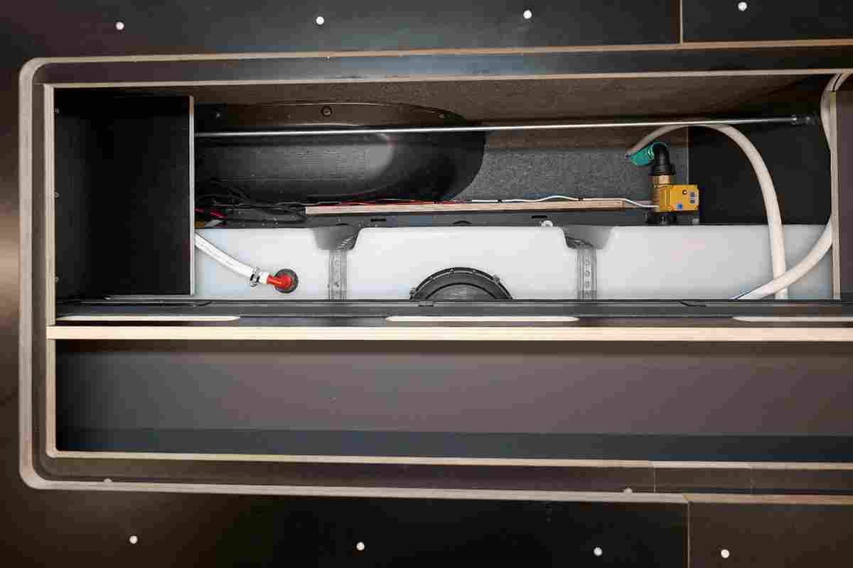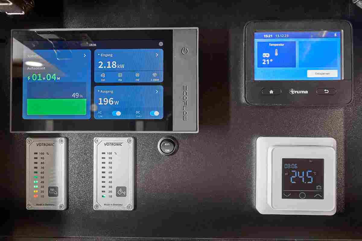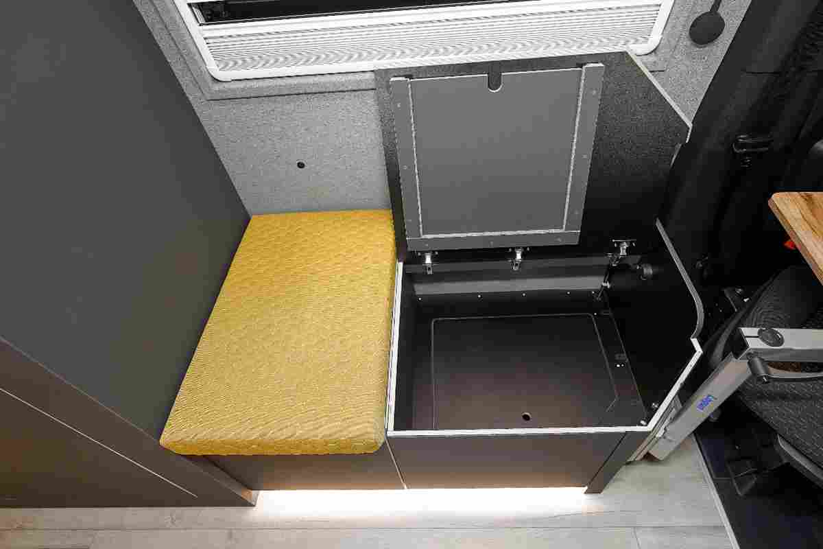 Ein beleuchteter Versatz entlang der Möbelfronten setzt subtile Akzente und verleiht dem Innenraum Tiefe und Atmosphäre. Ergänzt wird das Konzept durch innovative Ausstattungsdetails wie das EcoFlow Independence Kit für autarke Stromversorgung und einen Fliesenspiegel aus echtem Stein – Ausdruck von Funktionalität und Exklusivität zugleich.