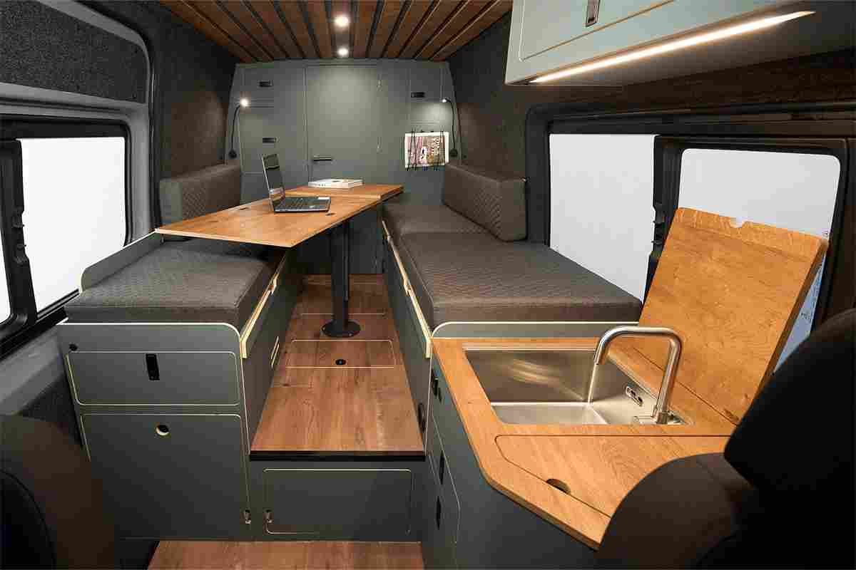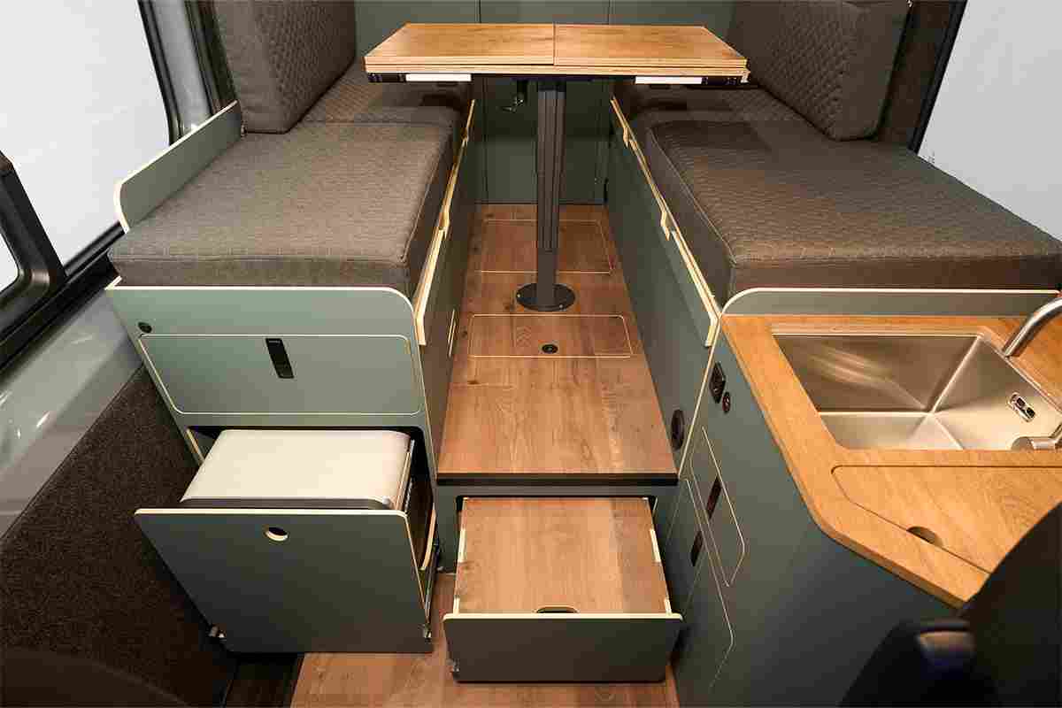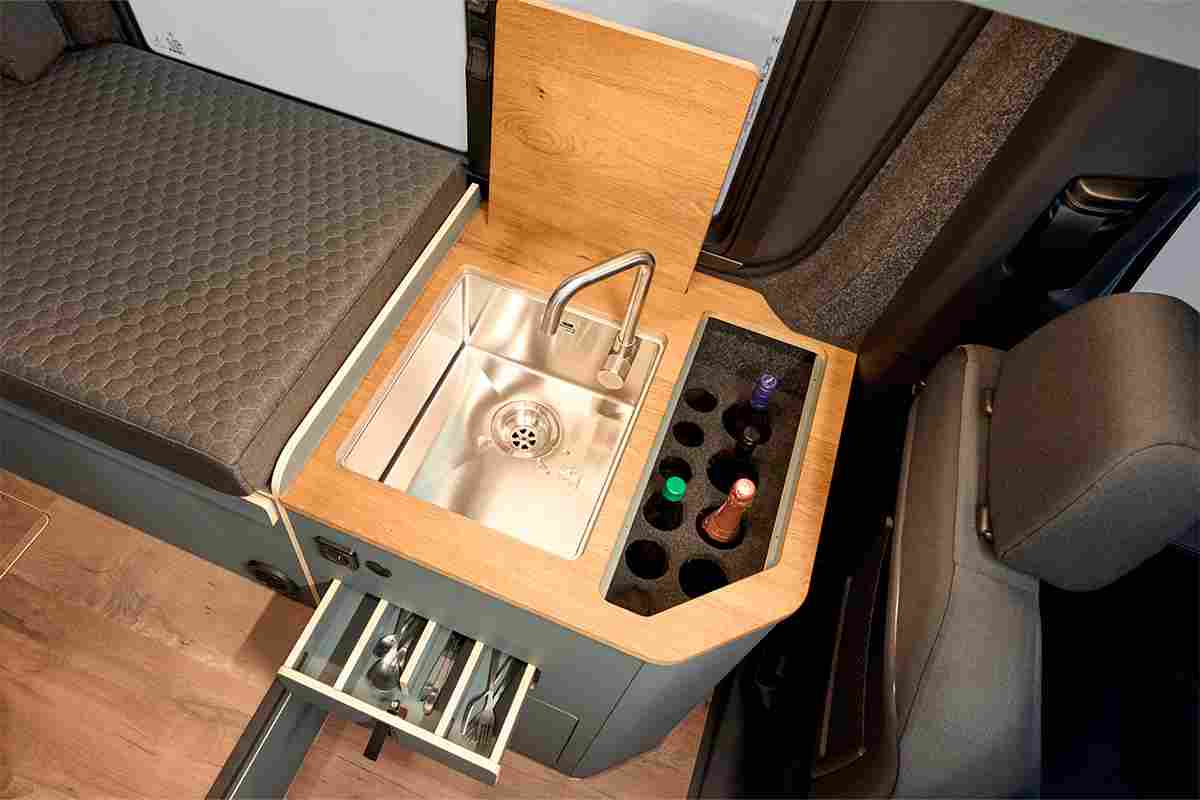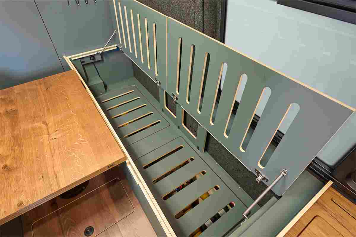Die Küche folgt bewusst einer reduzierten Linie, um Raum für das Wesentliche zu schaffen – ergänzt durch reichlich Stauraum unter den Sitzflächen und eine individuell gefertigte Decke, die den Innenraum optisch streckt und ihm eine luftige Weite verleiht.