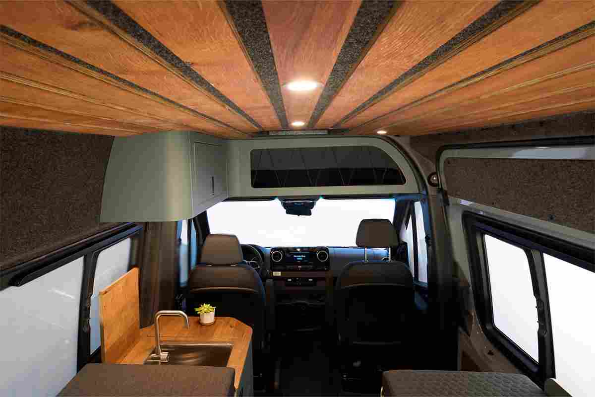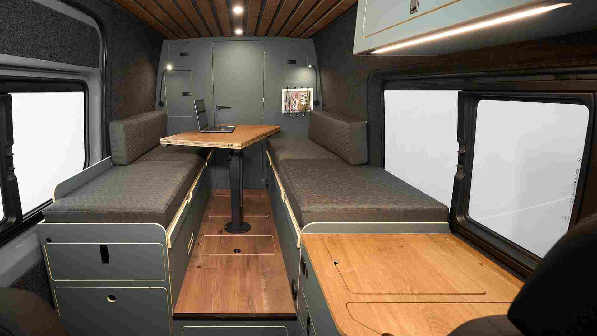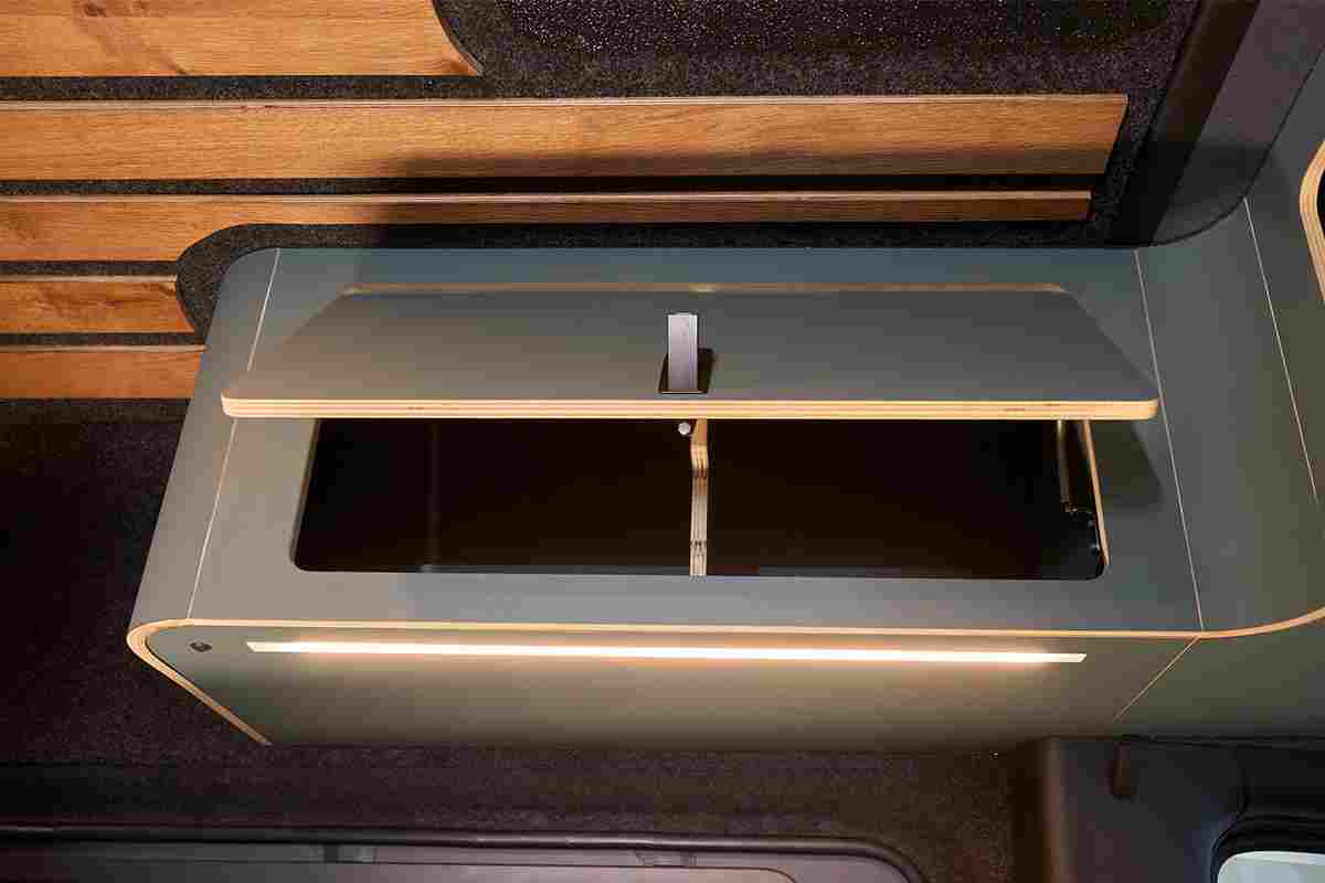 Die Küche folgt bewusst einer reduzierten Linie, um Raum für das Wesentliche zu schaffen – ergänzt durch reichlich Stauraum unter den Sitzflächen und eine individuell gefertigte Decke, die den Innenraum optisch streckt und ihm eine luftige Weite verleiht.