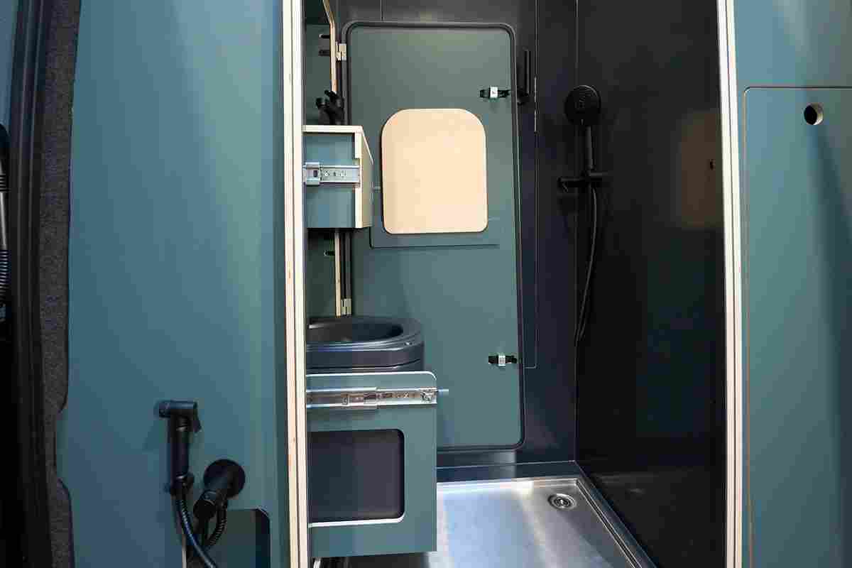 Das Badezimmer wurde direkt hinter den Hecktüren platziert – kompakt, funktional und clever gelöst: Waschbecken und Trockentrenntoilette sind ausziehbar und schaffen so auf kleinstem Raum maximalen Komfort.
