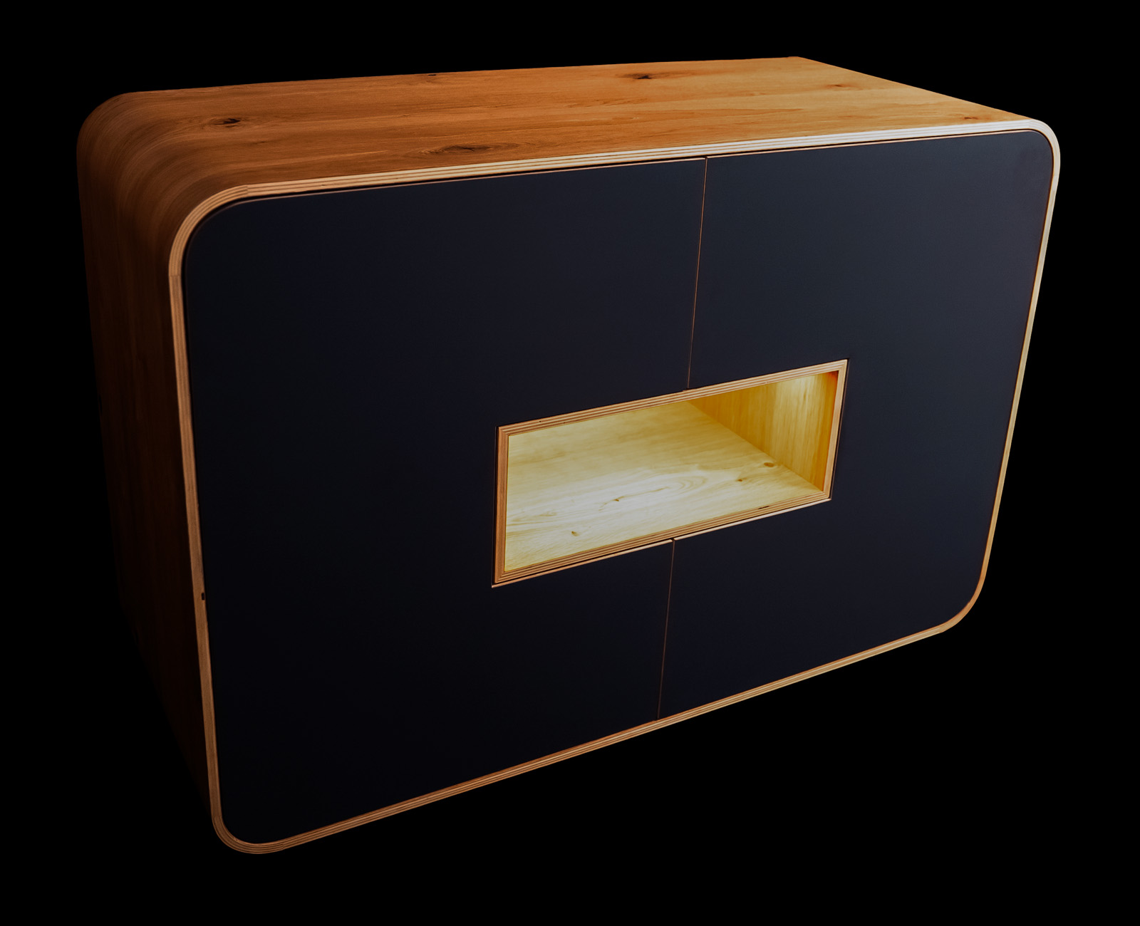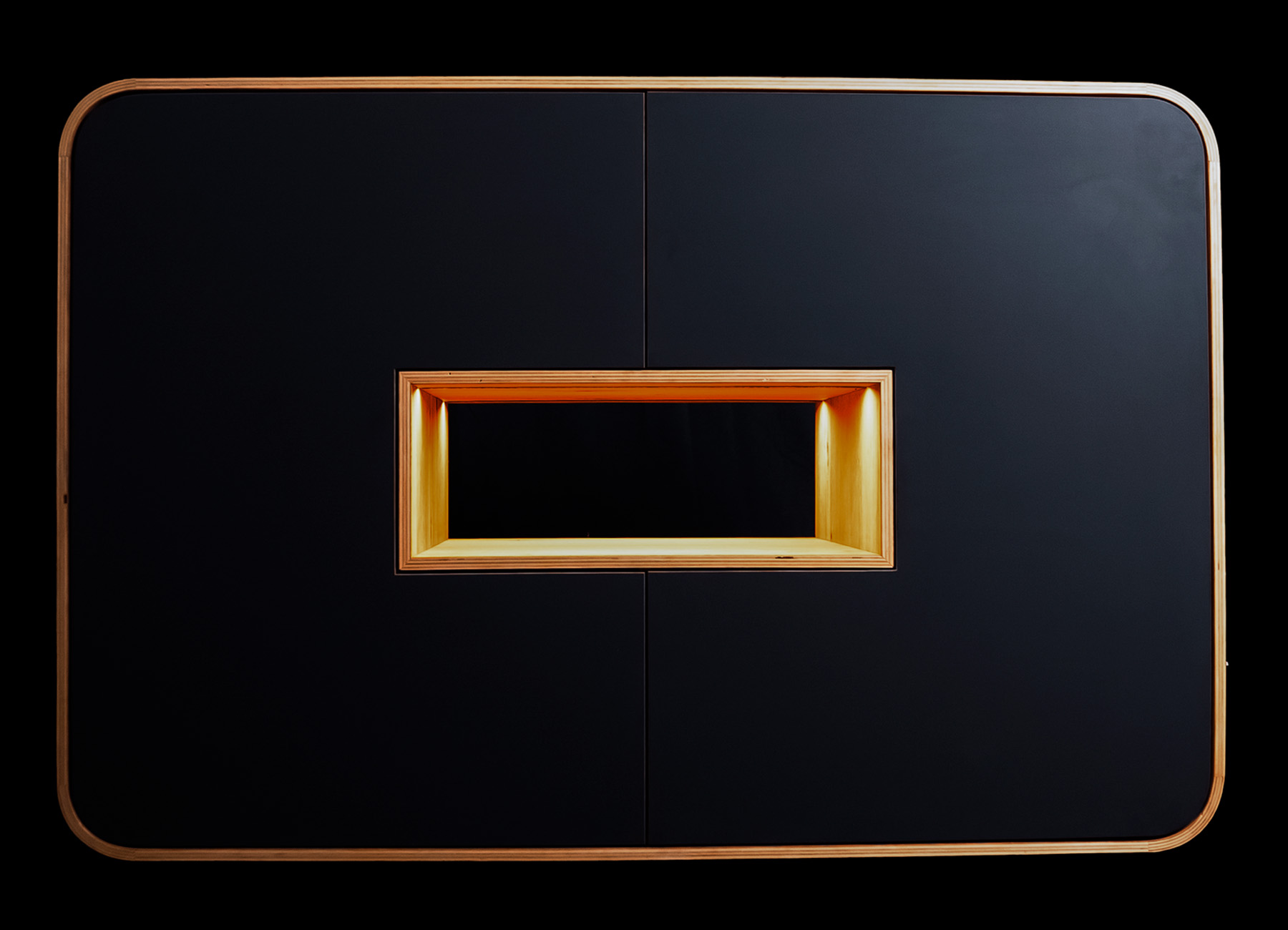 This sophisticated piece of furniture combines clean lines with a warm wooden frame and focuses on understated elegance. The matt black surface creates a modern, minimalist look, while the central, softly illuminated niche is an eye-catcher.