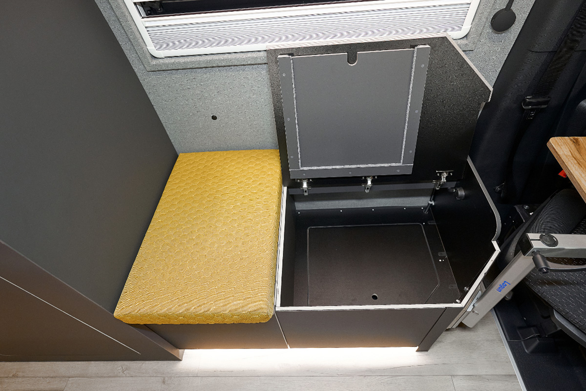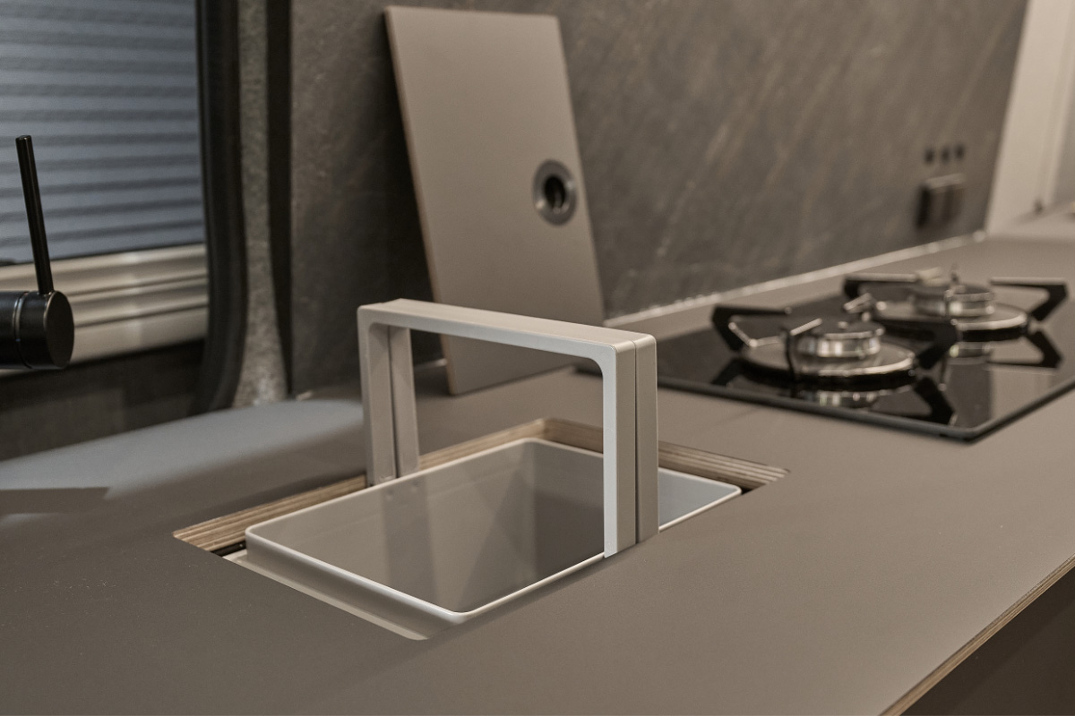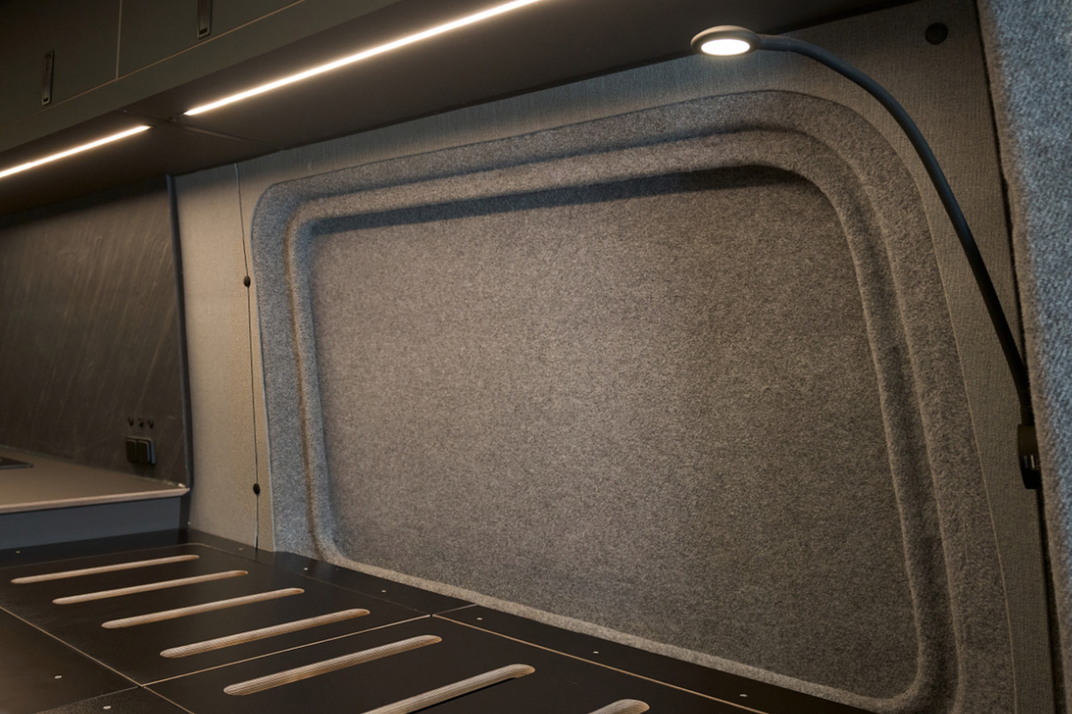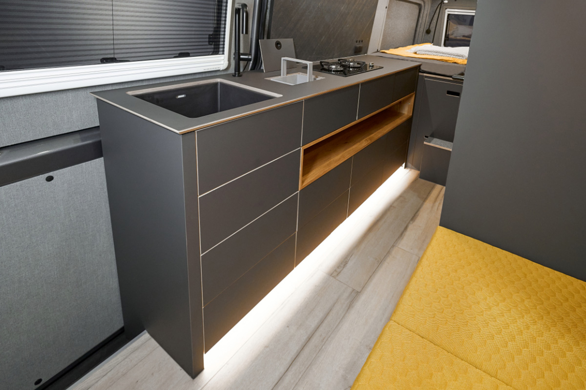 Un desplazamiento iluminado a lo largo de los frentes de los muebles pone acentos sutiles y confiere profundidad y atmósfera al interior. El concepto se complementa con detalles de equipamiento innovadores, como el Kit de Independencia EcoFlow para un suministro de energía autosuficiente y un salpicadero de azulejos de piedra auténtica: una expresión de funcionalidad y exclusividad al mismo tiempo.