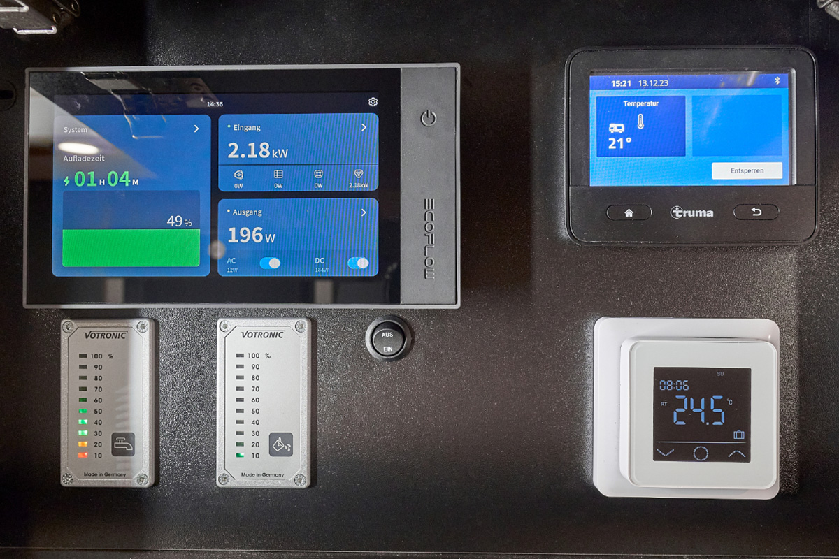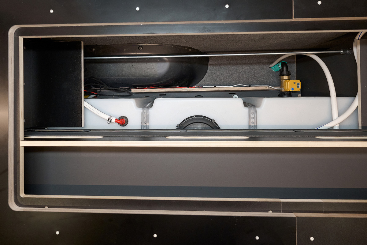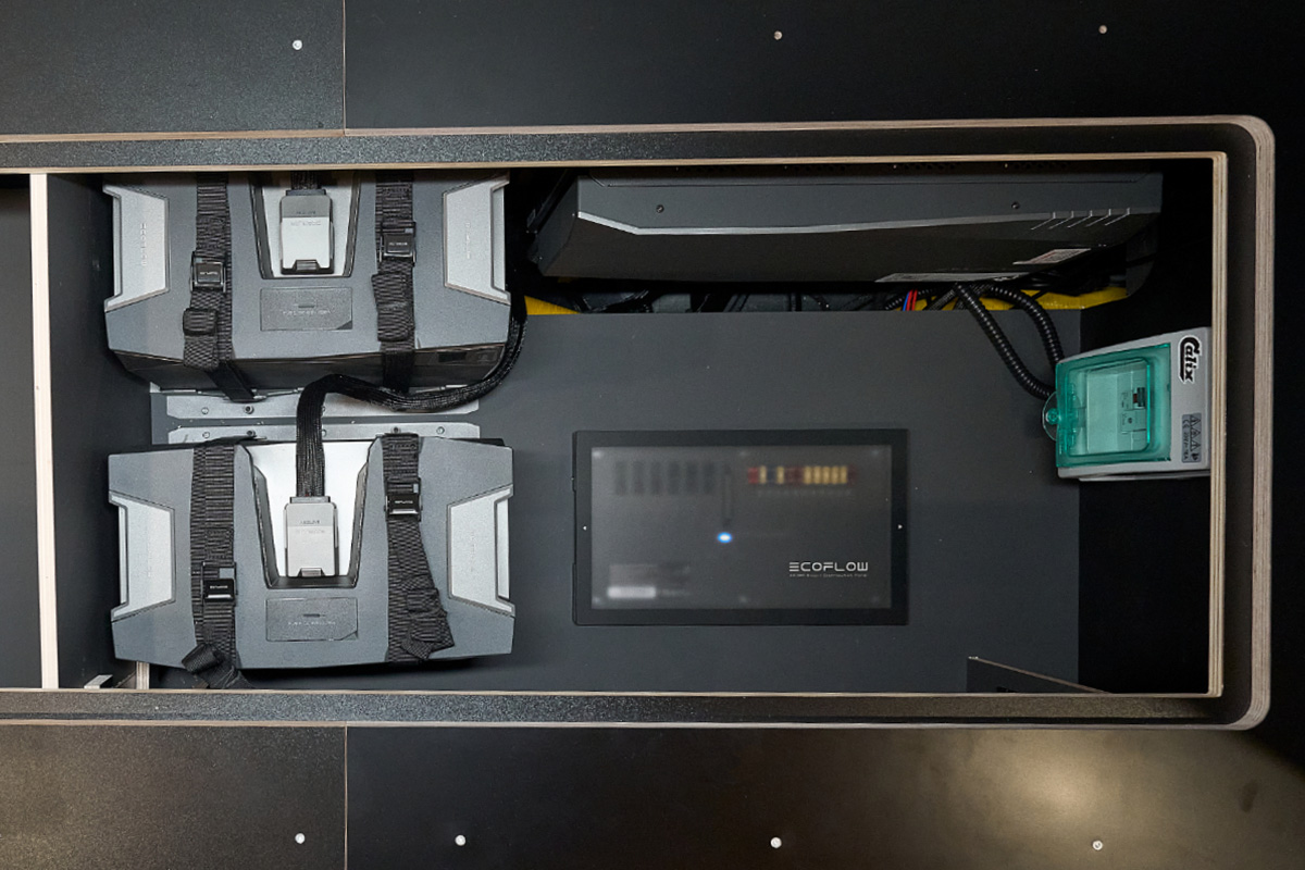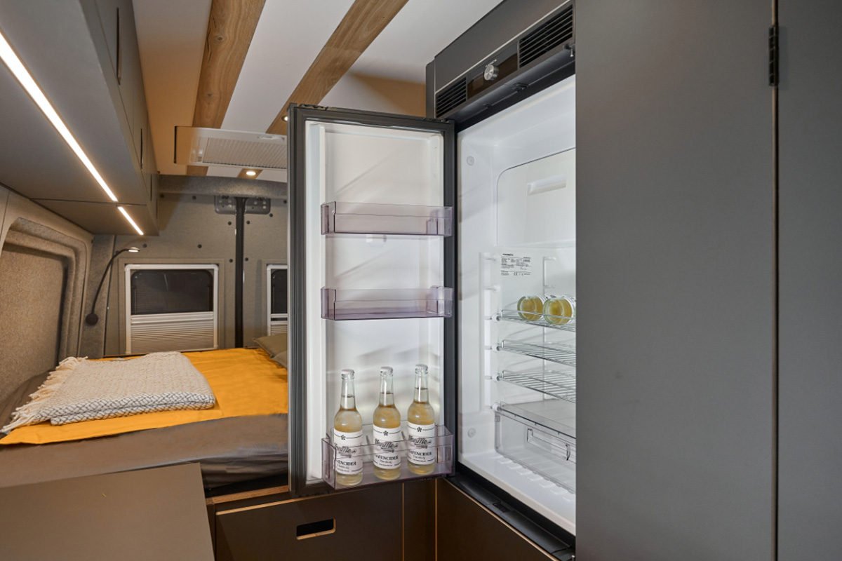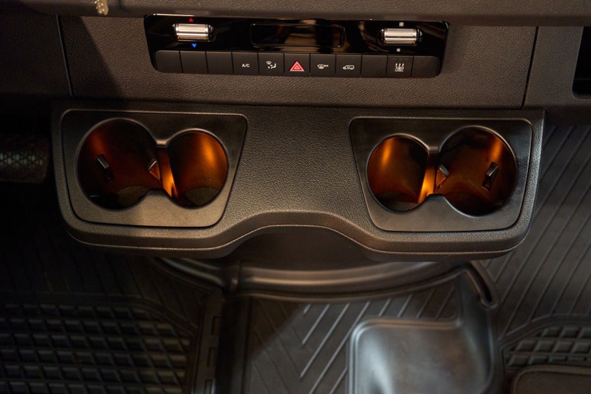Un desplazamiento iluminado a lo largo de los frentes de los muebles pone acentos sutiles y confiere profundidad y atmósfera al interior. El concepto se complementa con detalles de equipamiento innovadores, como el Kit de Independencia EcoFlow para un suministro de energía autosuficiente y un salpicadero de azulejos de piedra auténtica: una expresión de funcionalidad y exclusividad al mismo tiempo.