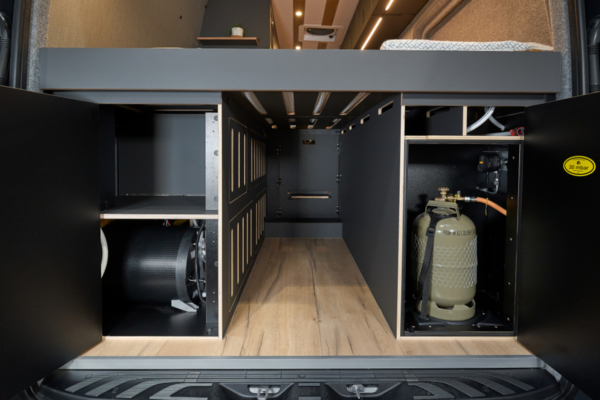 La base es un Mercedes-Benz Sprinter con un peso total de 3,88 toneladas, tracción integral seleccionable, una longitud de 7 metros y una altura de 2 metros: un vehículo que combina potencia, espacio y elegancia.
