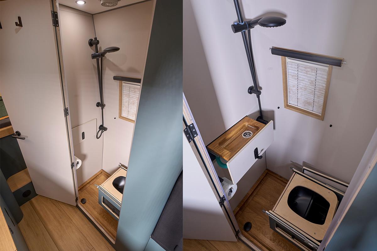 Les toilettes sèches séparées disparaissent sous les sièges de la dînette.