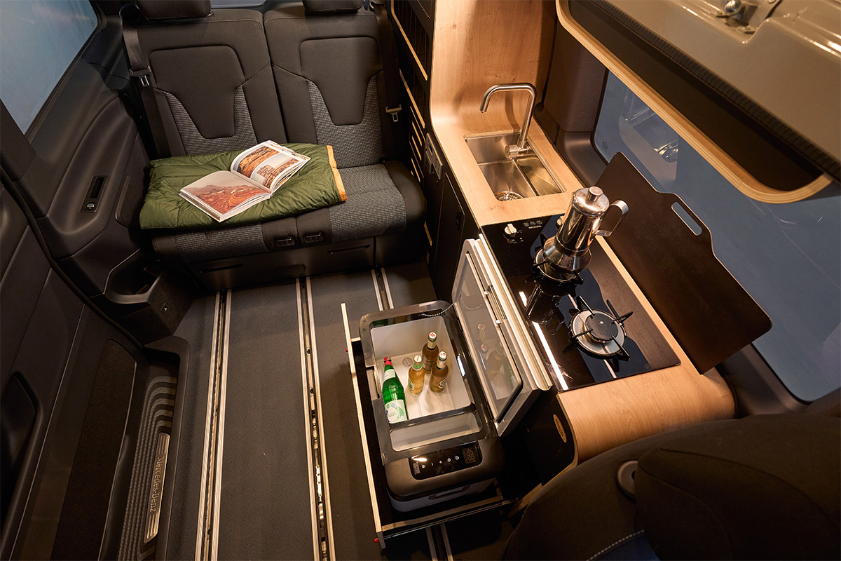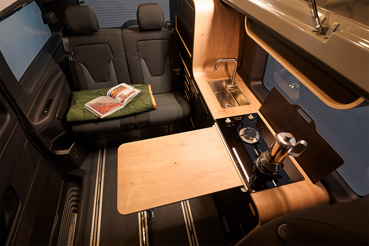 Meuble entièrement intégré dans l’habillage intérieur de la Mercedes Benz EQV