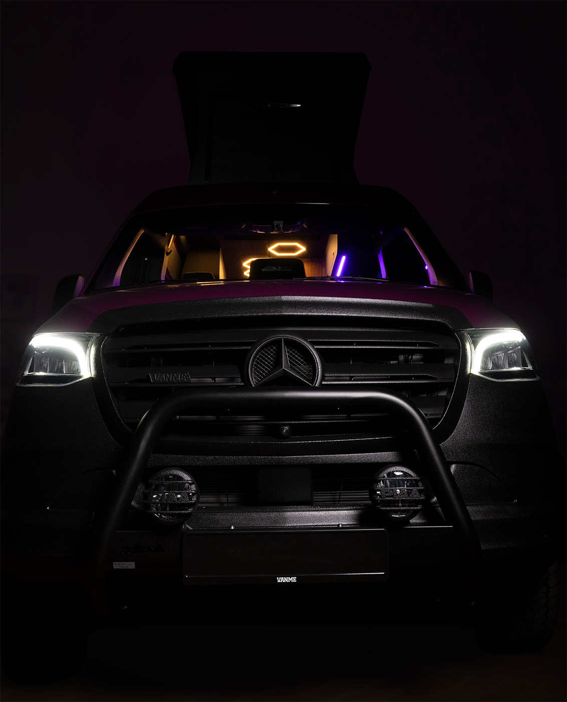 Niffler prende una posizione chiara anche all’esterno. Il sorprendente look viola è una dichiarazione voluta. Tutte le parti in alluminio sono anodizzate in viola, mentre l’anello dei cerchi off-road è verniciato nel colore del veicolo. Il tetto pop-top Campany estende lo spazio verso l’alto e sottolinea il carattere da spedizione di questo Sprinter L3H2.