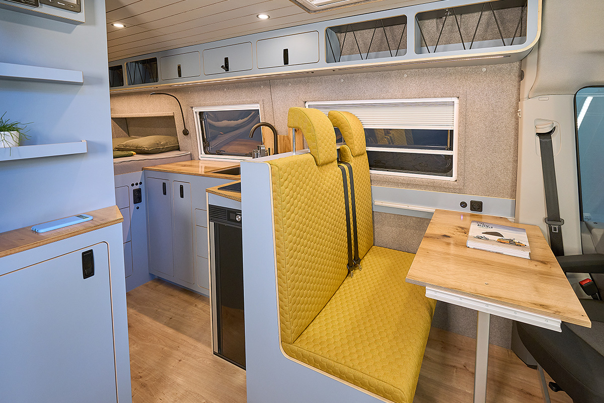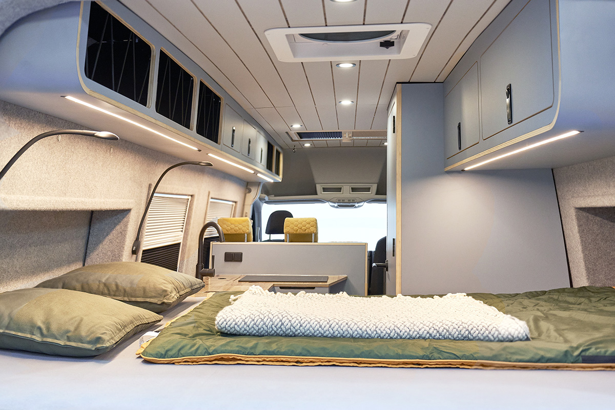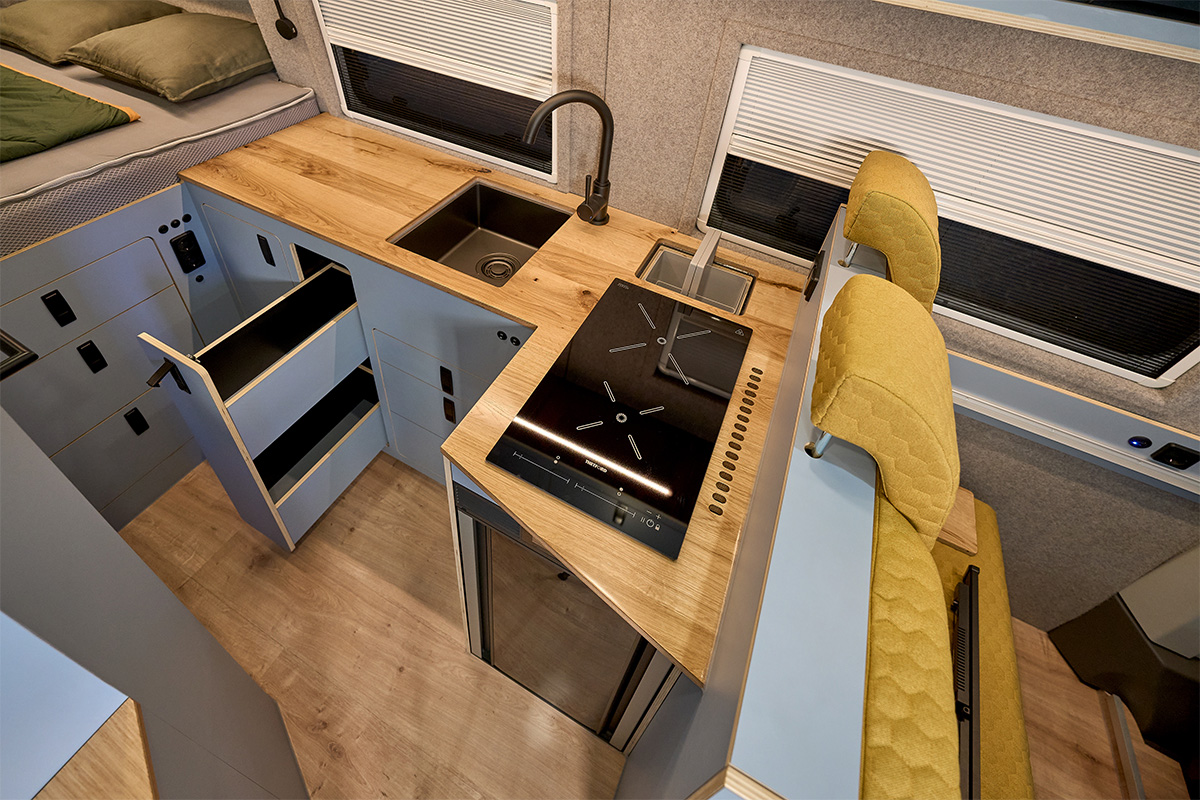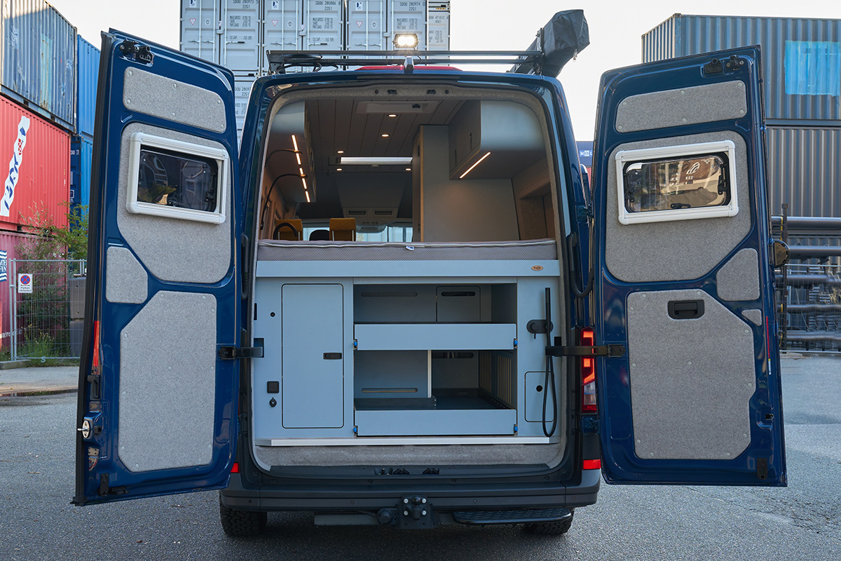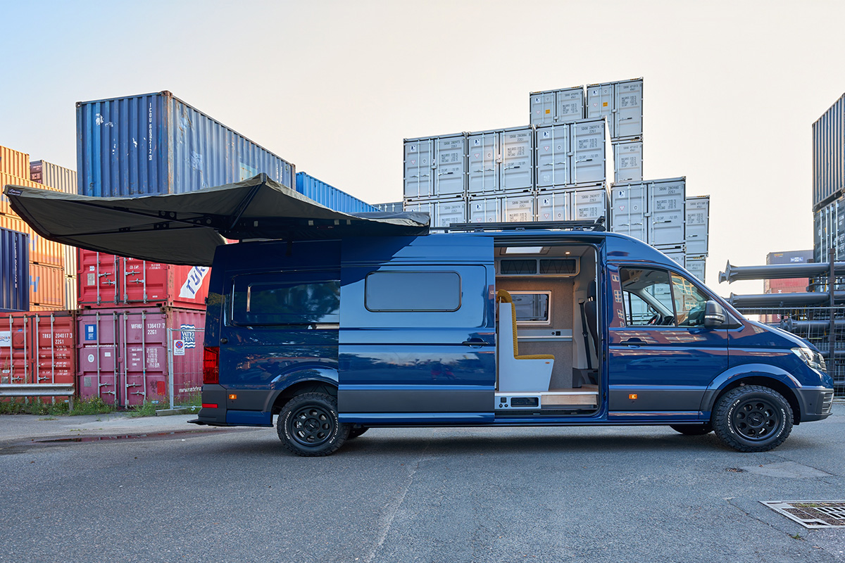 La base: una Volkswagen Crafter lunga 6,80 metri con trazione integrale. Su questa base è stato creato un concetto di spazio completamente nuovo che si concentra senza compromessi sulla chiarezza e sul comfort. Le zone giorno e notte sono volutamente separate l’una dall’altra, mentre la cucina e il bagno si trovano al centro del veicolo. Ciò significa che il flusso dei movimenti è perfettamente organizzato e che ogni area può essere vissuta con i propri tempi: il massimo del relax in uno spazio ridotto.