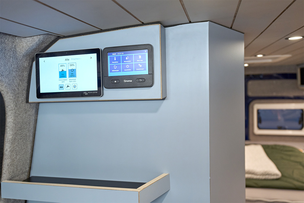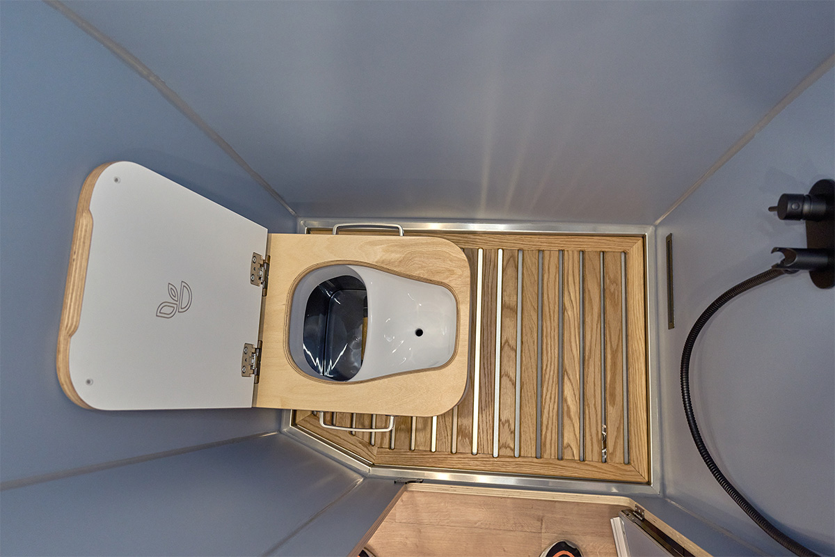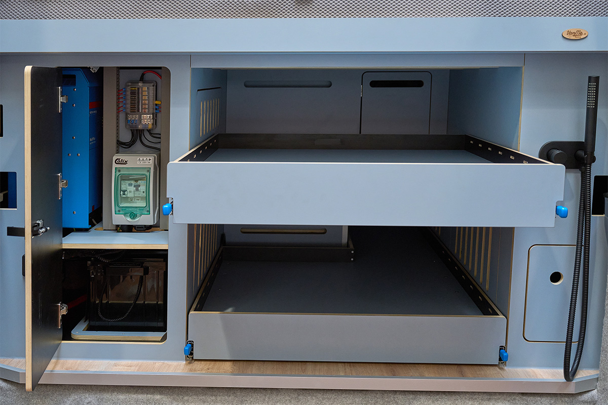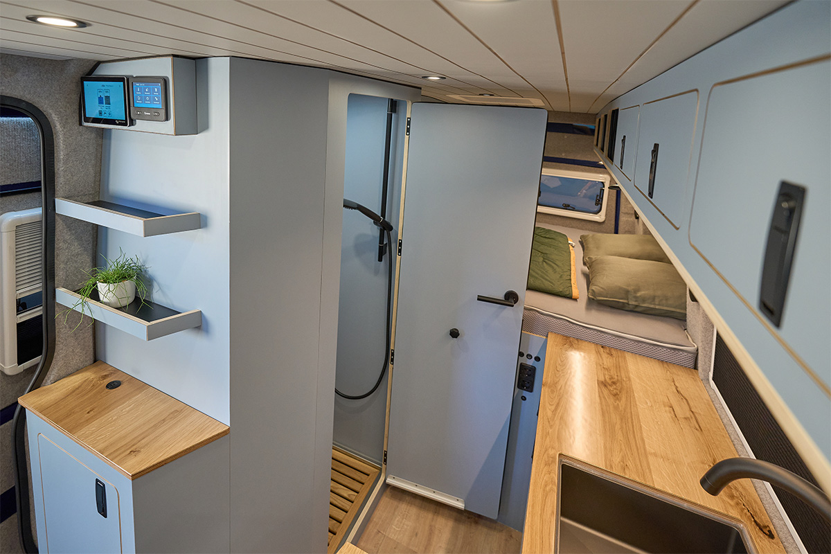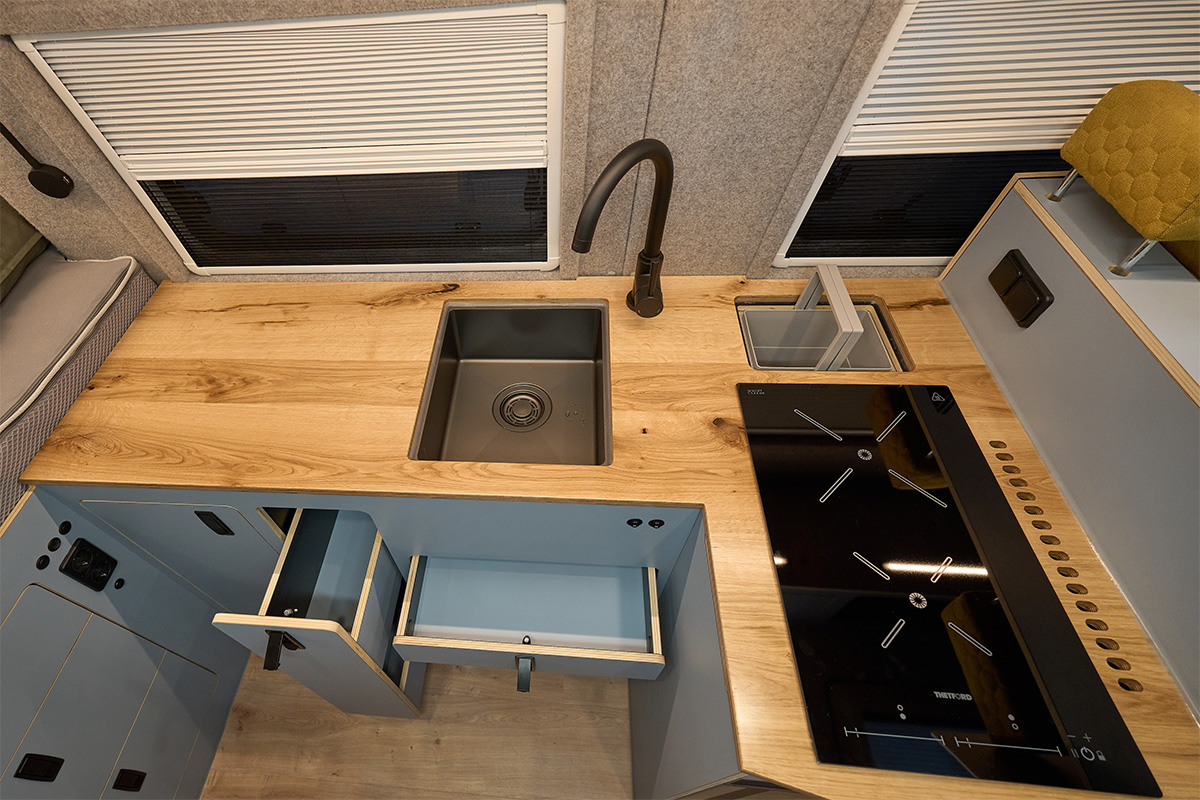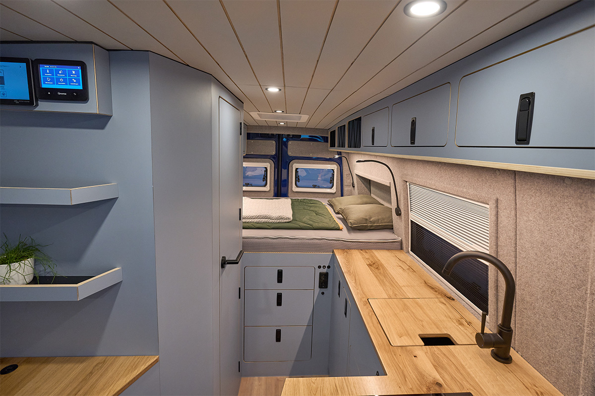 La base: una Volkswagen Crafter lunga 6,80 metri con trazione integrale. Su questa base è stato creato un concetto di spazio completamente nuovo che si concentra senza compromessi sulla chiarezza e sul comfort. Le zone giorno e notte sono volutamente separate l’una dall’altra, mentre la cucina e il bagno si trovano al centro del veicolo. Ciò significa che il flusso dei movimenti è perfettamente organizzato e che ogni area può essere vissuta con i propri tempi: il massimo del relax in uno spazio ridotto.