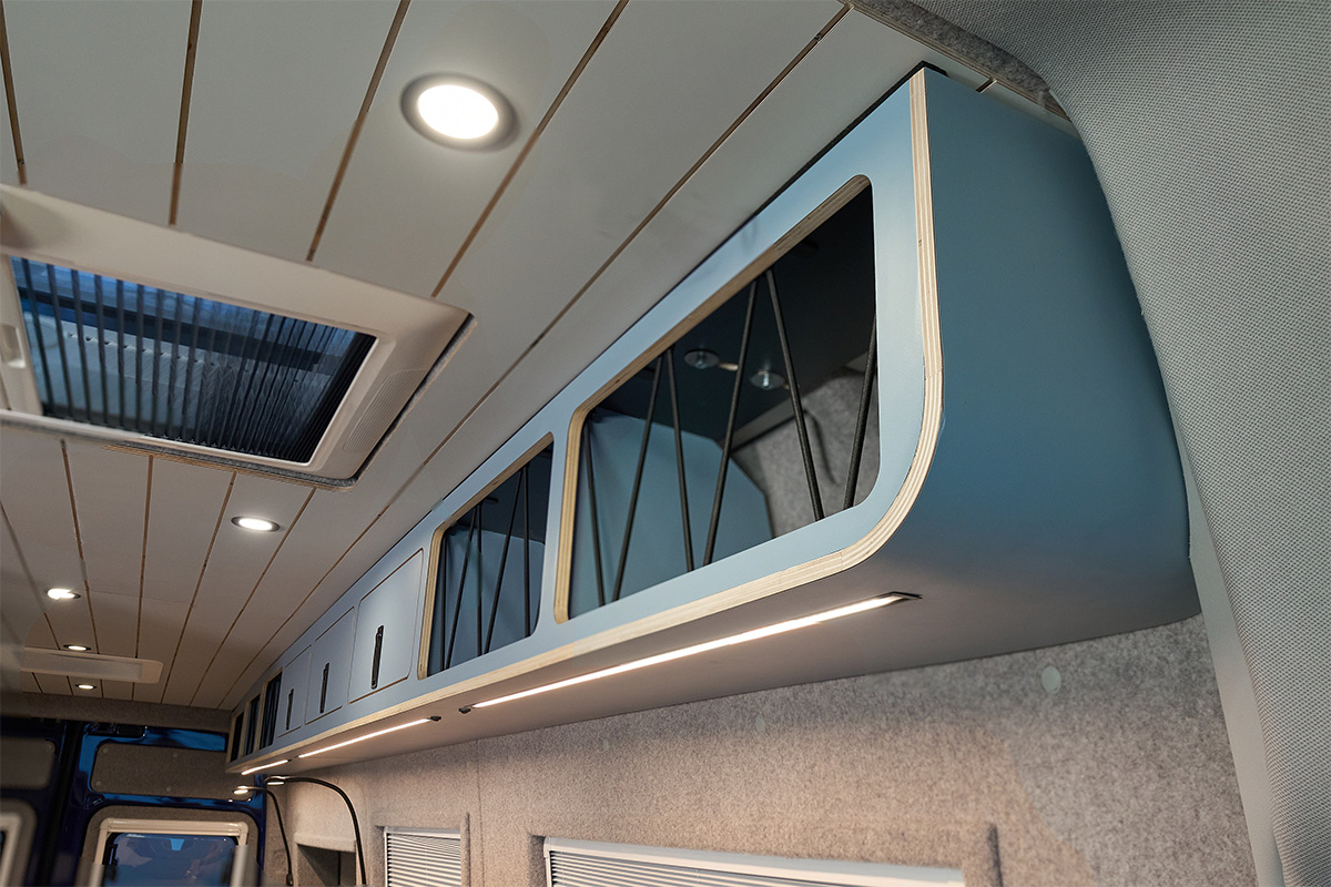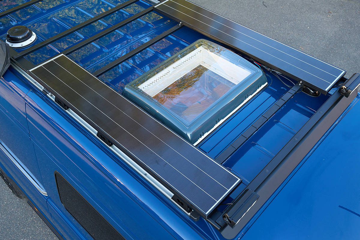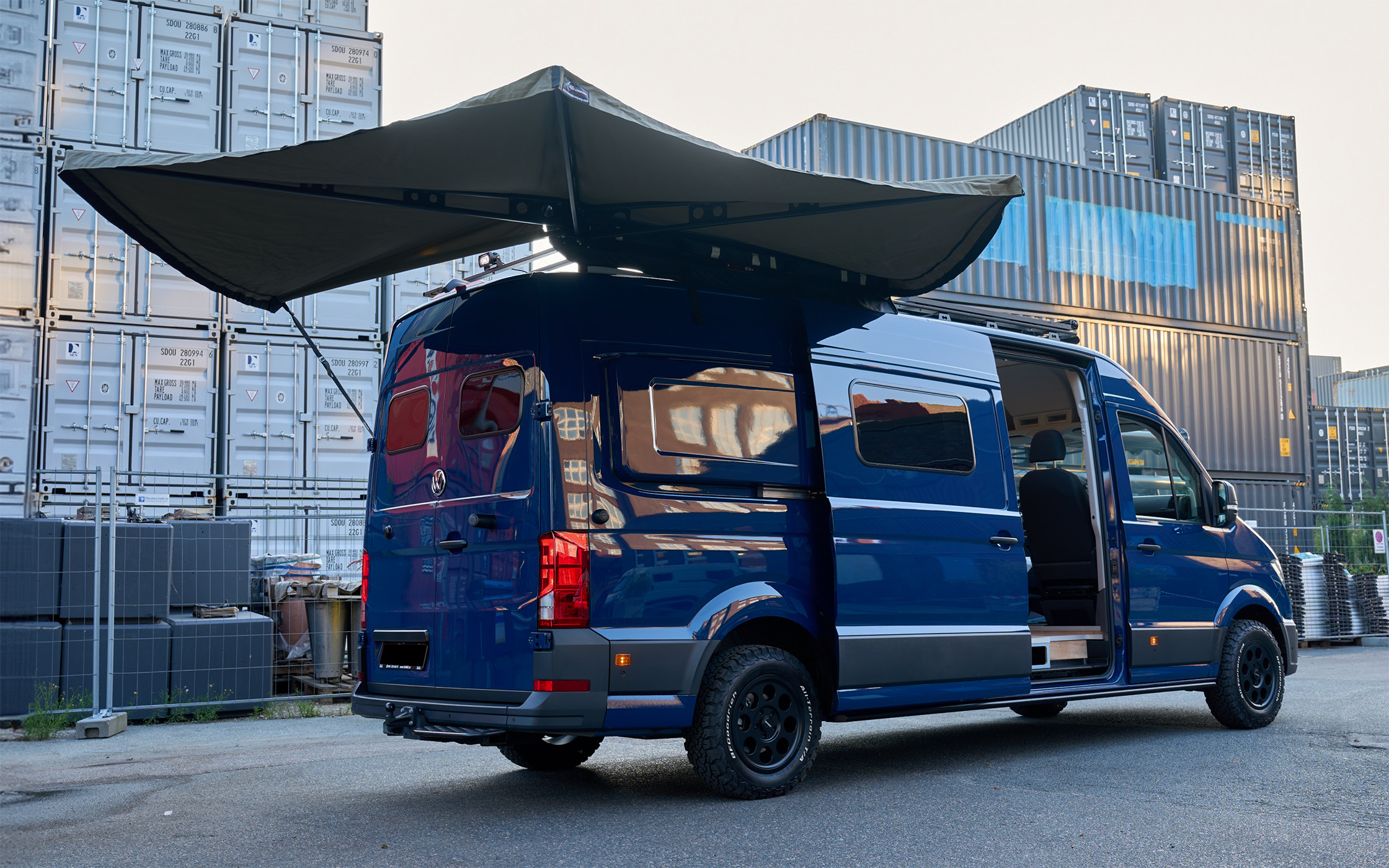 Il Blue Lobster offre uno spazio generoso per quattro viaggiatori. E se gli ospiti vogliono rimanere, l’elegante tenda sul tetto del portapacchi trasforma il furgone in una casa con sei posti letto in un attimo.