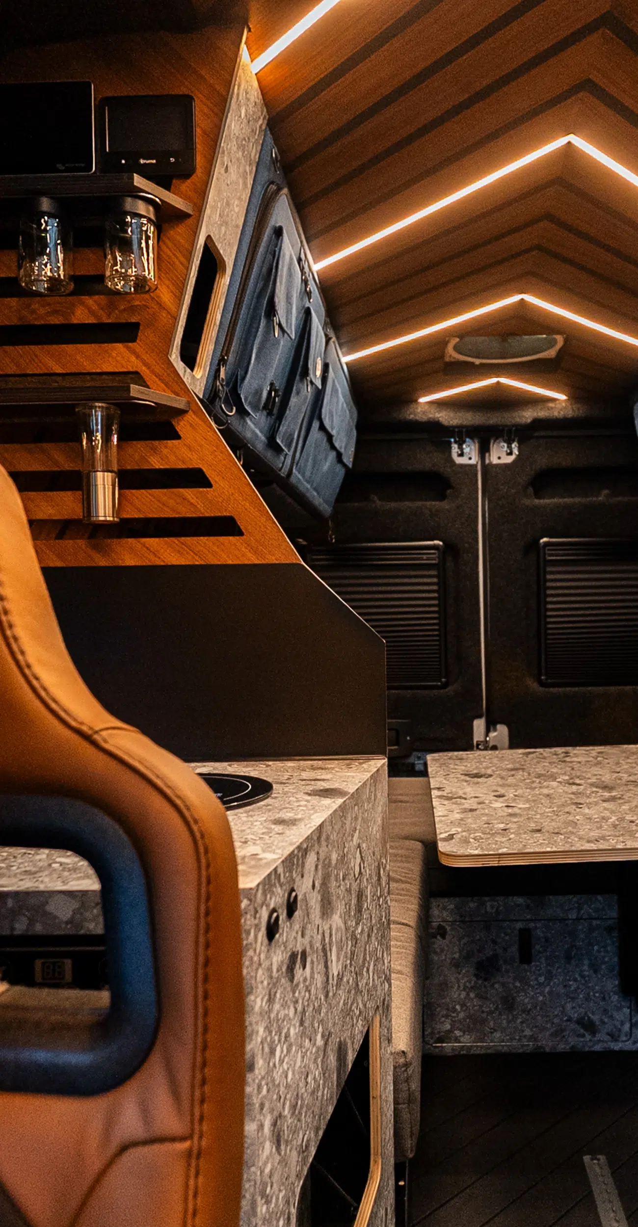 Geradlinige Formen und kraftvolle Quader verleihen dem Interieur eine fast skulpturale Präsenz. Und doch bleibt das Fahrzeug in seiner Funktion beeindruckend leicht: Trotz der umfangreichen Ausstattung bietet es eine bemerkenswerte Zuladung von 600 kg.